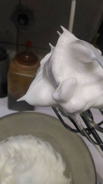 (呈現蛋白霜的形狀,拉起會滴落下來),千萬不能打成固體的蛋白霜