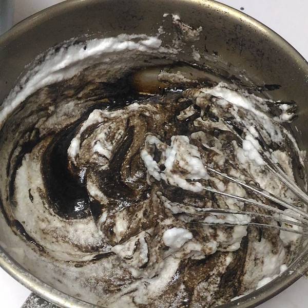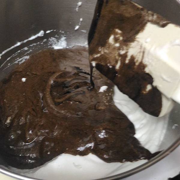 Step10 : 攪拌完成再將可可面糊倒入蛋白霜,再用攪拌器用切半的手法混合均勻