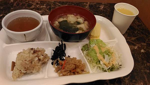 (飯糰、味增湯,醬菜、生菜、麵包、果汁、咖啡、茶)