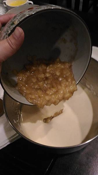 Step4 : 加入香蕉泥,用刮刀手動攪拌均勻(請勿用力攪拌)