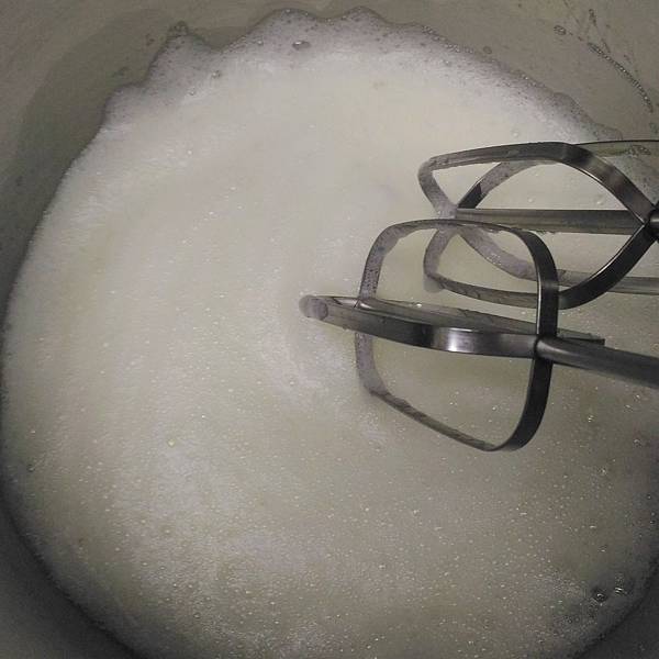 Step5 : 將蛋白用攪拌機(快速) 打至起泡,停機,加入砂糖