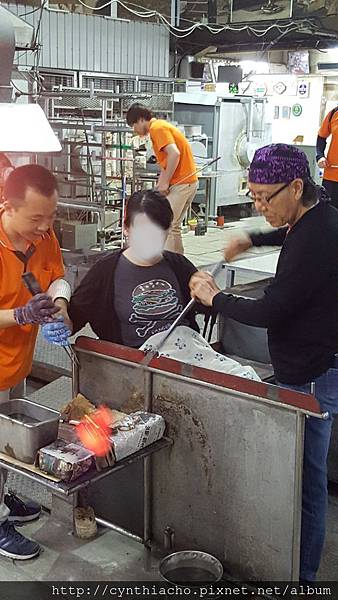 我吹玻璃吹到一半,他就很技巧的快速將鐵管抽出